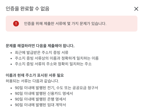 이후 5번 정도 아래의 본인인증 실패 화면을 본 이후에야, 겨우 본인인증을 받을 수 있었다.