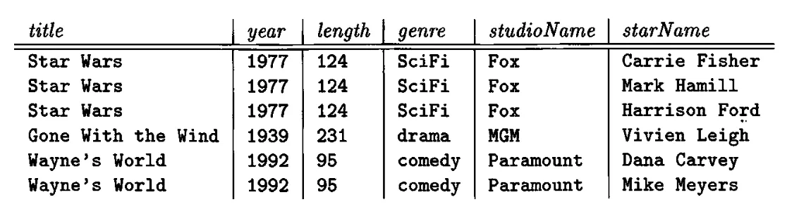 - 수정이상(Update Anomalies): Star Wars의 length를 124에서 125로 수정하려 하니, 3번이나 수정해줘야한다.