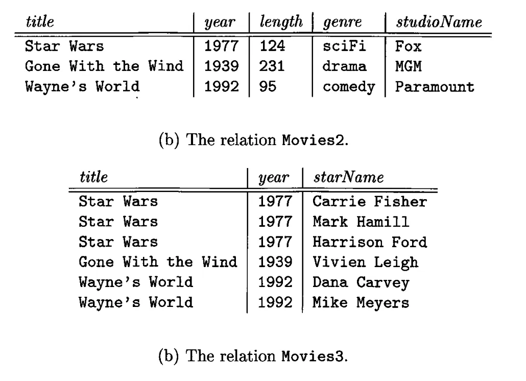 이 문제들을 해결할 접근 방법 중 하나는 릴레이션을 분해(decompose)하는 것이다. 위 Movies1 relation을 Movies2와 3로 분해한 것은 아래와 같다. Movies2와 Movies3의 속성들의 합집합은 Movies1과 같아야한다.