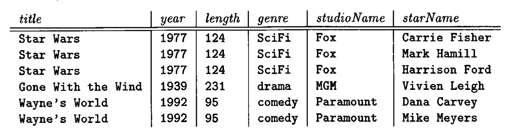 2. 수정이상(Update Anomalies): Star Wars의 length를 124에서 125로 수정하려 하니, 3번이나 수정해줘야한다.