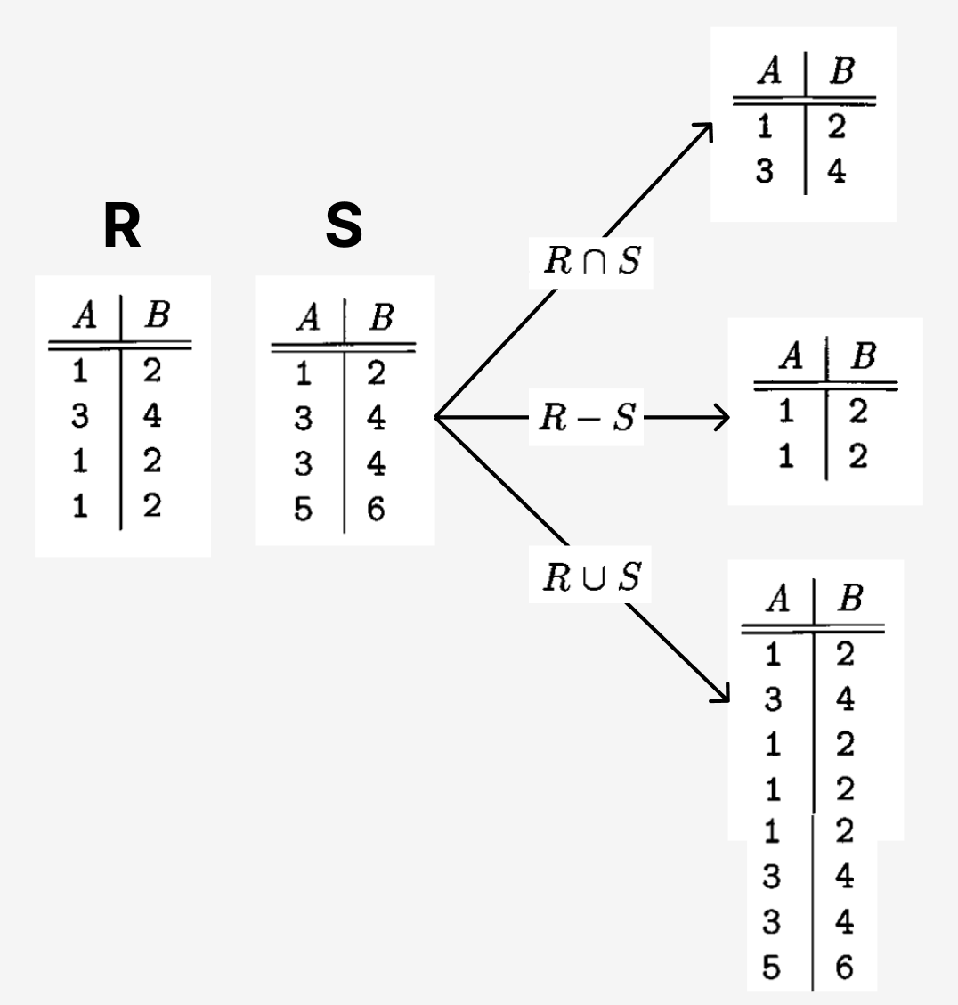 먼저 집합 연산들이다. 튜플 t가 두 릴레이션 R과 S에서 각각 n개, m개 들어있다고 하면, 각 연산의 결과는 다음과 같다.