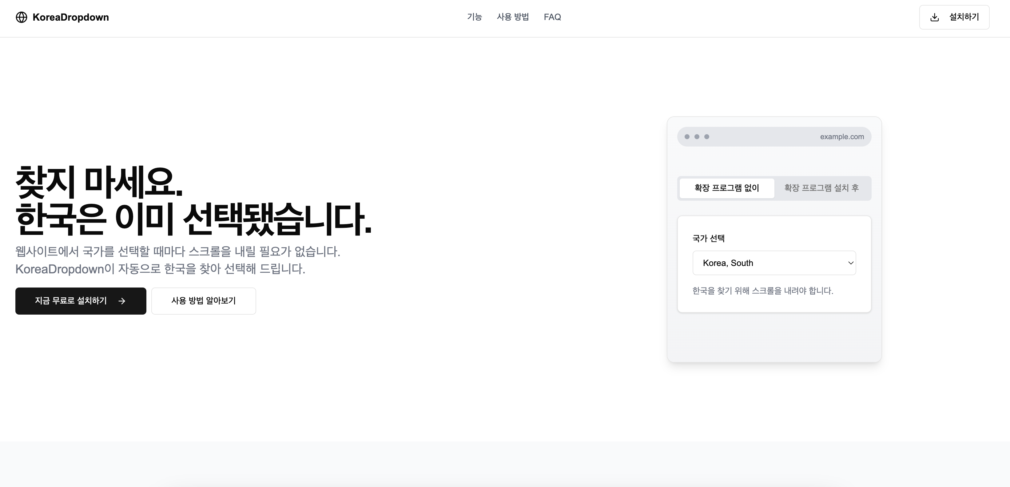 작은 규모의 익스텐션임에도 별도의 랜딩 페이지를 제공한다는 점이 제품의 완성도를 한층 끌어올린 느낌이었다. 이 익스텐션이 무엇을 하는지 바로 보여주고, 사용자가 체험해볼 수 있도록 한 뒤 "지금 무료로 설치하기" 버튼을 통해 크롬 웹스토어로 자연스럽게 연결되는 플로우가 인상적이었다. 수직 플렉스박스 구조로 구성된 랜딩 화면에는 자주 묻는 질문과 후원 링크까지 포함되어 있다.