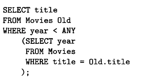 지금까지 알아본 서브쿼리들은 일단 쿼리를 실행한 후, 나온 결과를 부모 쿼리에 치환해두면 끝나는 것처럼 보였다. 그러나, 지금 소개할 “Correlated subquery”는 부모 쿼리의 검사하려는 튜플마다 매번 새롭게 연산해야하는 경우이다. 서브쿼리의 두번째에 등장한 title 앞에 Old. 를 붙여서 scope를 명시한 것을 주의해서 봐야 한다.