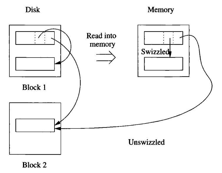 위 그림에서, 블럭1의 첫번째 레코드는 두개의 포인터를 갖고 있다. 이 레코드가 메모리에 올라갈 때, 포인터의 주소는 그대로 데이터베이스 주소를 갖는 것이 아니라, 메모리 주소를 가리킬수 있도록 스위즐(swizzle)되었다. 이때 메모리에 따라 로딩된 레코드를 고정(pinned)되었다고 한다. 번역 테이블에 새로운 행이 추가된 것이다. 반면, 블럭2는 아직 메모리에 올라가지 않았기 때문에 스위즐 되지 못했다. 나중에 블럭2가 올라갈 시점에 다시 그 포인터를 스위즐할지말지 정할 수 있게 되고 그것은 전략의 차이이다. 3가지 전략이 있다.