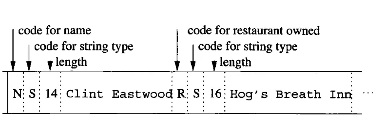XML 같은 가변길이의 레코드는 태그된 필드(tagged fields)들을 이용한다. 태그에는 필드의 이름, 필드의 타입, 필드의 길이 등이 포함된다. 아래 그림은 name과 restaurant owned 필드 정보를 갖는 XML을 저장한 결과이다.