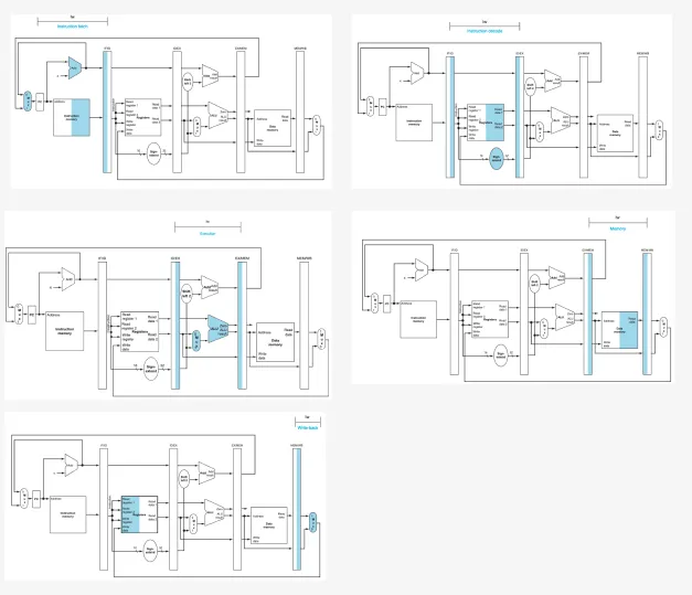 우리의 구조를 보자. 대부분의 데이터는 왼쪽에서 오른쪽으로 흐른다. 단, 위 피규어에서 파란색 화살표로 표시된 두 흐름은, 오른쪽에서 왼쪽으로 흐른다. 이 두 흐름은 각각 데이터 해저드와 컨트롤 해저드를 유발한다.