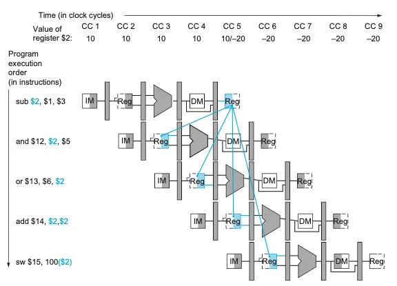 왼쪽의 다섯개의 인스트럭션 시퀀스를 실행하는 모습이다. $2 레지스터에는 원래 10이 담겨있었으나, 첫번째 인스트럭션의 실행 결과로, 5번째 사이클에서 -20으로 값이 달라졌다. 그다음 두번째 and 인스트럭션은 -20을 가지고 연산을 수행해야하지만, 레지스터에서 값을 읽은 3번째 사이클 때에는 $2의 값은 10이였다. 데이터 하자드가 발생했다.