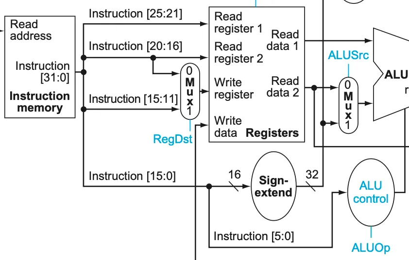 - EX: RegDst(목적지 레지스터가 rt인지 rd인지), ALUOp(ALU에서 어떤 연산을 할지), ALUSrc(ALU에 들어갈 피연산자가 rt인지 상수인지)