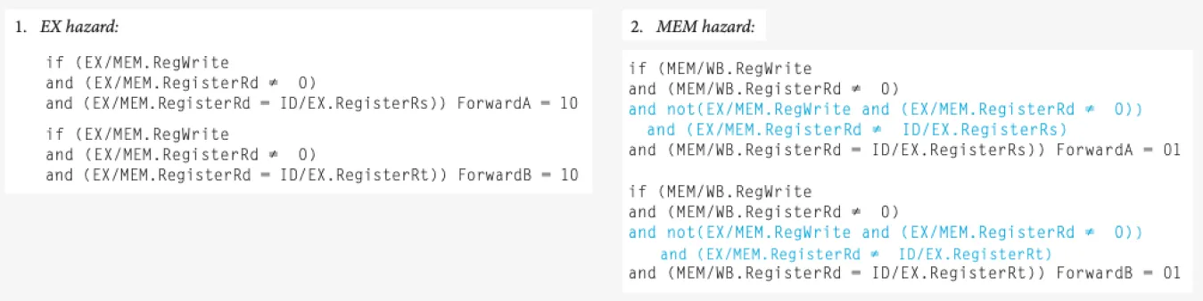 이 그림을 통해 이해할 수 있는것은, 앞선 인스트럭션의 WB 단계 이전에 이후 인스트럭션의 EX 단계가 실행될때, 문제가 발생한다는 것이다. 다르게 말하면, EX/MEM 혹은 MEM/WB 레지스터에 들어있는 rd 레지스터 넘버가, ID/EX 레지스터의 rs 혹은 rt 레지스터의 넘버와 같을 때 데이터 하자드가 일어남을 알 수 있다. 이 내용을 수식적으로 표현하면 아래와 같다.