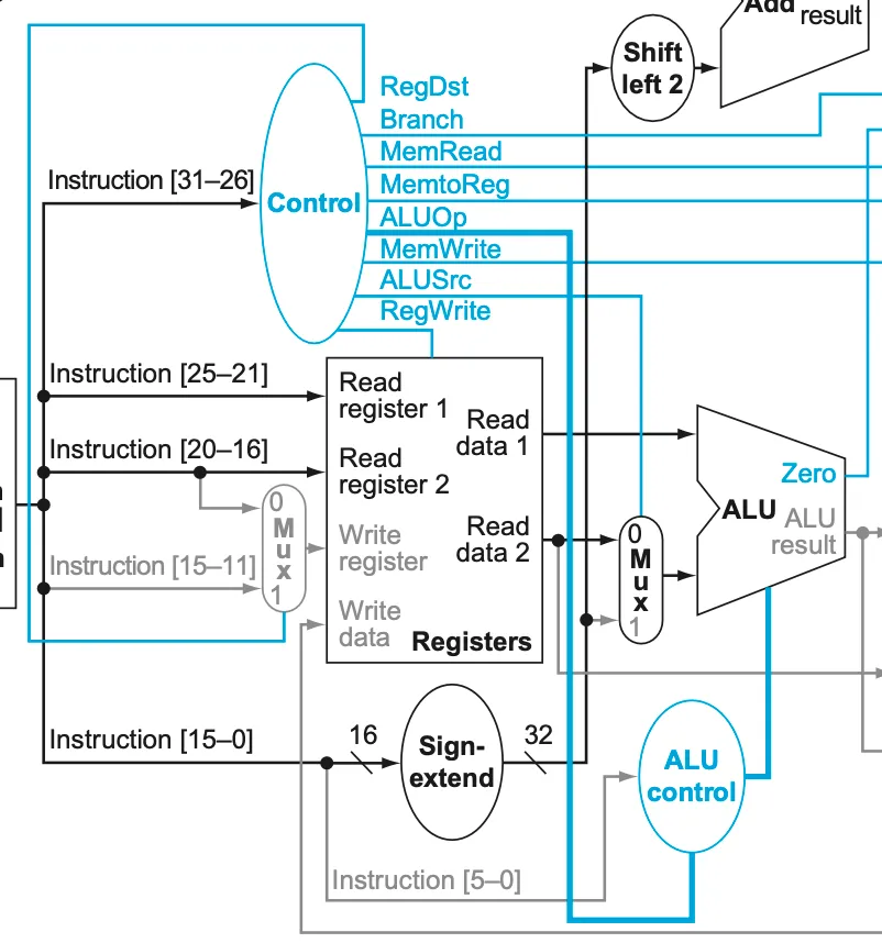 - EX: RegDst(목적지 레지스터가 rt인지 rd인지), ALUOp(ALU에서 어떤 연산을 할지), ALUSrc(ALU에 들어갈 피연산자가 rt인지 상수인지)