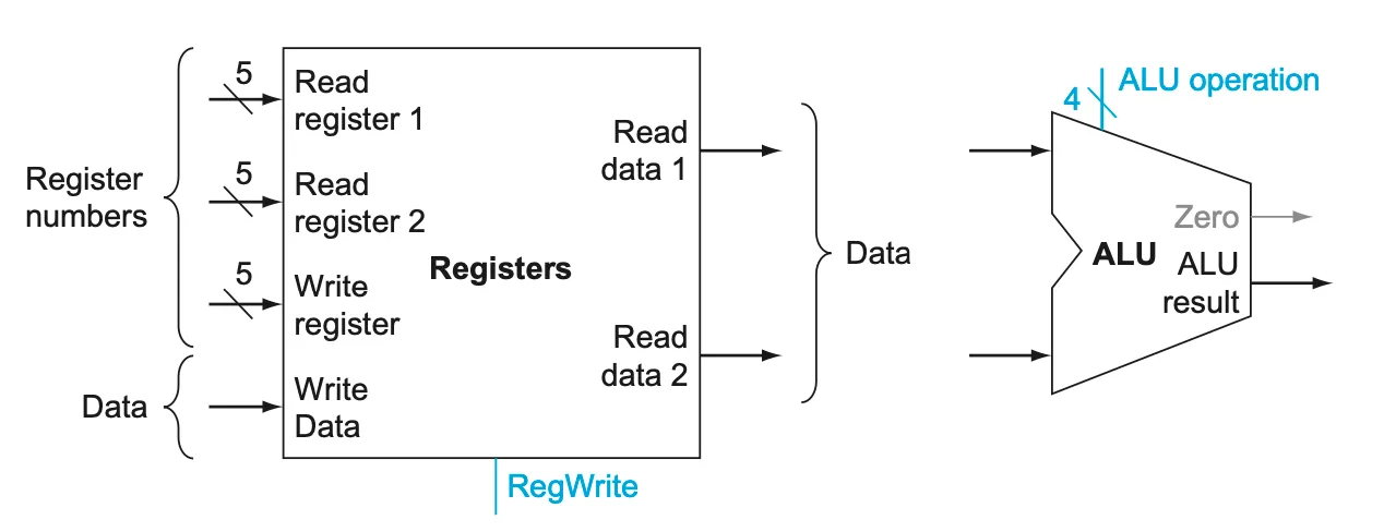 ALU는 두 개의 32비트 입력을 받아, 32비트 출력을 반환한다. 만약, 출력값이 0이라면 1비트짜리 추가 시그널을 Zero에 반환한다. 또, ALU는 다양한 연산을 수행하기에, 4비트짜리 컨트롤 라인도 입력으로 받는다. 추후에 다시 다룬다.