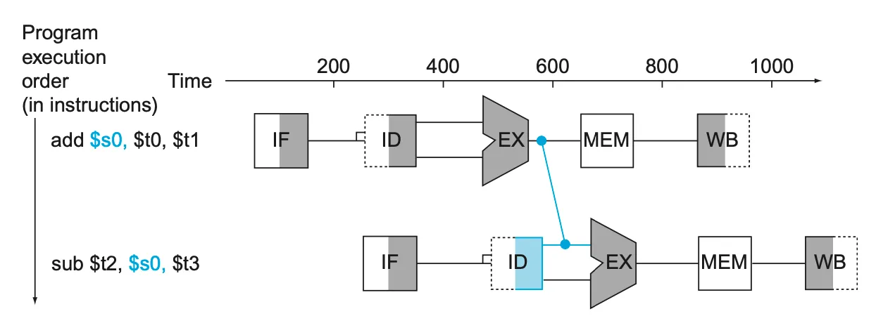 내놓을 수 있는 다음 해결책은 포워딩(forwarding, or bypassing)이라고 부른다. add가 WB 과정까지 수행하고 나서야, sub의 ID가 실행되는 것은 너무 비효율적이다. add의 EX과정이 ALU에서 끝나자마자(덧셈 연산이 끝나자마자) 그 값을 sub 인스트럭션에서 넘겨 받는다면 좀 더 빠를 것이다. sub 인스트럭션이 일단 ID를 수행하고, 동시에 add는 EX 과정(덧셈)을 수행한다. 그리고, sub의 EX를 시작하기 전, 레지스터에서 읽어온 $s0 값 대신, add의 덧셈 결과를 덮어써서 연산에 이용한다면 파이프라이닝에 전혀 지연이 없다. 이것을 포워딩이라고 부른다. 아래의 피규어로 표현했다.
