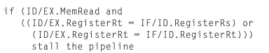 그래서 우리는 forwarding unit에 이어서, hazard detection unit을 추가할 것이다. 이것은 ID 단계에서 동작하며, load 연산과 그 다음 load된 값을 사용하는 연산 사이에 stall을 추가한다. 조건은 아래와 같을 것이다.