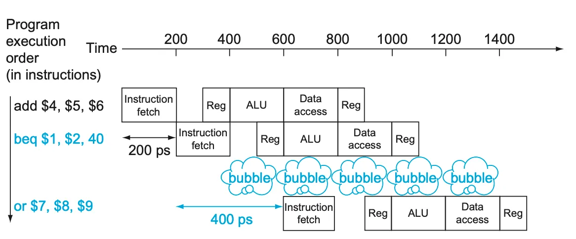 해저드의 세번째 종류이다. 인스트럭션의 실행결과에 따라, 다음에 어떤 인스트럭션을 실행할지가 정해지는 경우이다. 해결할 수 있는 첫번째 방법은 이번에도 “기다리기”이다. IF 단계에서, 이번에 실행해야할 인스트럭션이 beq(branch if equal) 임을 알았다면, beq가 EX 단계을 수행해야, 다음에 실행할 인스트럭션을 알 수 있다. 그떄까지 기다리면 된다.