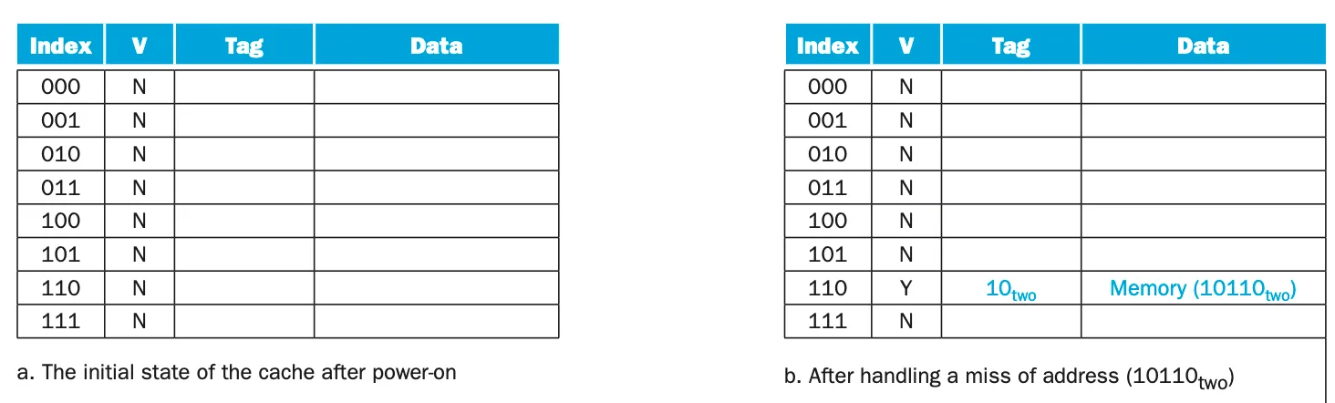 캐시라는 이름은 프로세서와 메인 메모리 사이의 추가 계층을 표현하기 위한 단어로 주로 사용된다. 또한, 지역성 측면의 이점을 누리기 위한 부가적인 저장소를 표현하는 단어로 사용된다. 이 챕터에서는 프로세서 요청은 하나의 워드, 하나의 블럭 또한 하나의 워드로 구성된 매우 단순한 캐시를 다룬다. 아래의 그림에서 프로세서가 워드 Xn을 요청하기 전까지는 캐시에 없었으나, 미스가 난 후 워드 Xn은 메모리로부터 캐시로 옮겨졌다.
