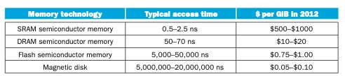 오늘날의 메모리 계층구조를 구현하는 네 가지 핵심 기술에 대해 알아보자. 첫째로, 메인 메모리의 구현에 쓰이는 DRAM과, 둘째로, 프로세서(캐시)에 가까운 계층에서 사용되는 SRAM이 있다. DRAM은 비트 당 가격이 SRAM보다 저렴하지만, 느리다. 가격이 차이나는 이유는, DRAM이 같은 비트를 저장하는데에 특히 더 적은 양의 면적, 즉, 더 적은 양의 실리콘을 사용하기 때문이다. 속도에서 차이가 나는 이유는 부록 B를 참고하라. 세번째 기술은 플래시 메모리(flash memory)이다. 플래시 메모리는 비휘발성으로, 모바일 기기의 2차 기억장치(secondary memory)로 사용된다. 네 번째로, 가장 크고 느린 메모리인 자기 디스크(magnetic disk)이다.