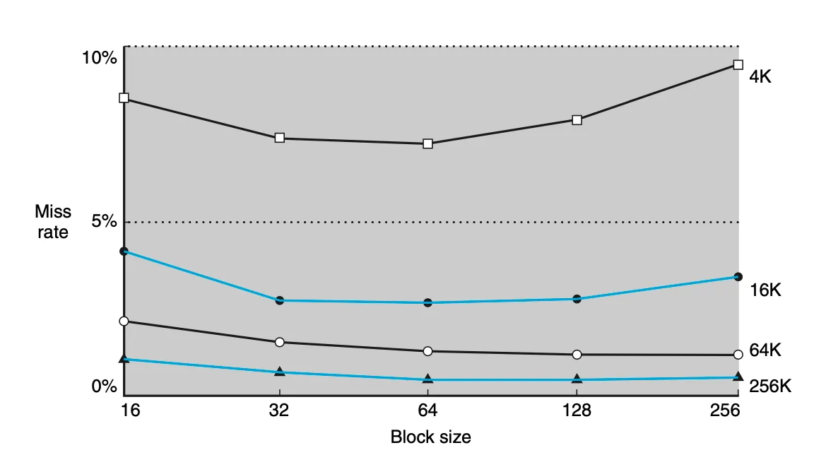 캐시 블럭의 크기가 커질수록, 공간적 지역성을 더 활용하기에 미스 비율은 낮아진다. 그러나, 캐시 블럭의 크기가 너무 커져도, 전체 캐시 블럭의 수를 줄여서 블럭끼리의 경쟁을 심화하기 때문에, 오히려 미스 비율이 다시 높아진다. 아래 차트에서 4개의 선은 각각 다른 캐시 크기를 의미하고, x 축은 캐시 블럭 크기를 의미한다.