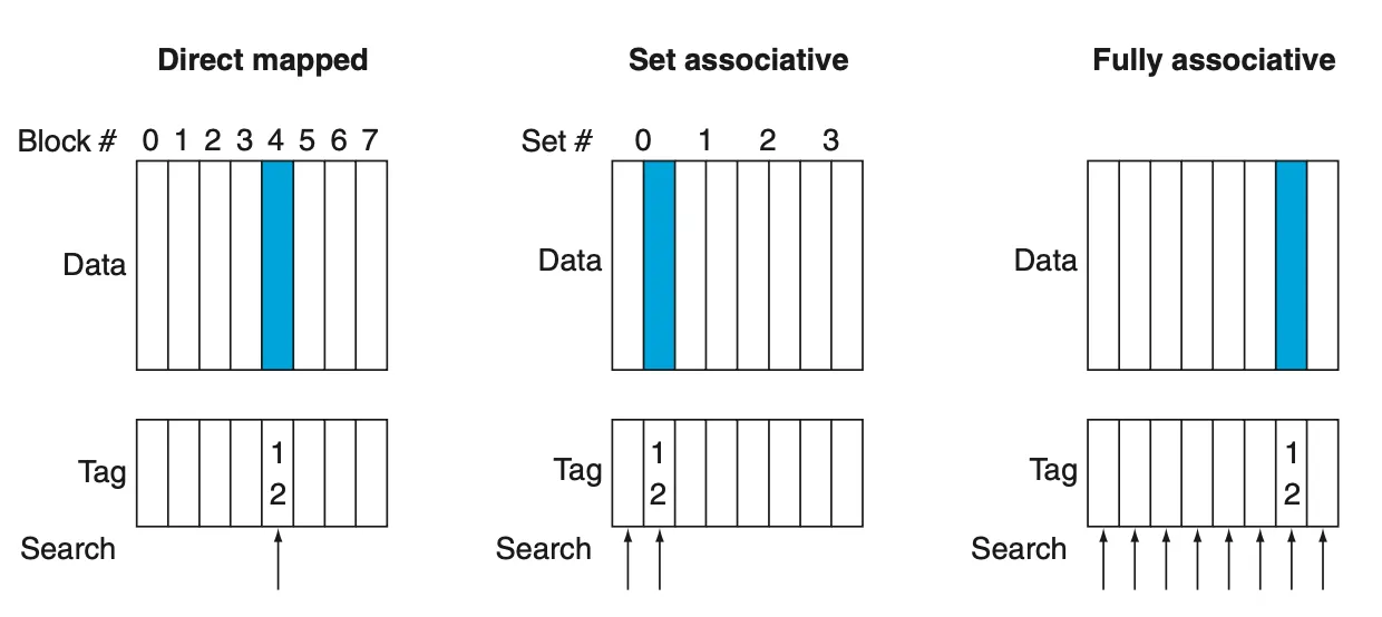 associativity의 차수를 늘리는 것은 미스 비율을 낮출 수 있지만, 히트 타임을 낮춘다. 아래의 그림을 생각하면 된다. Direct mapped 에서는 히트 여부 판단을 위해 하나의 태그만 확인 하면 되지만, 2-way set associative에서는 2개의 태그를, fully associative에서는 8개 모두의 태그를 확인해야 한다.