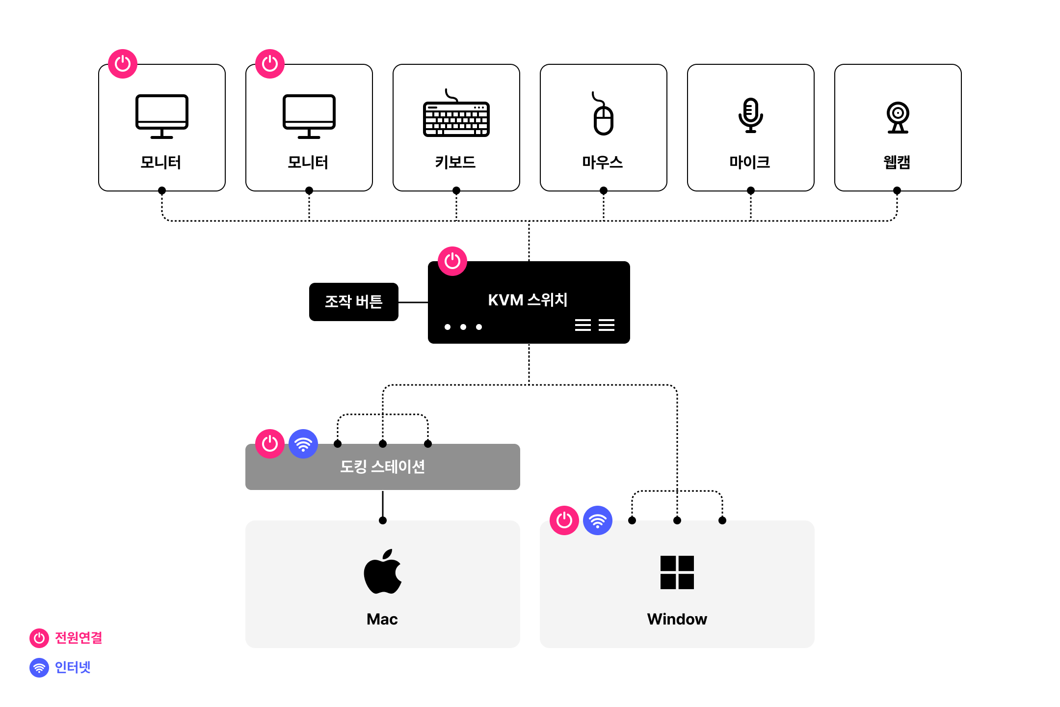 그림 속 kvm 스위치는 입출력 장치들과 두 pc를 분기하는 역할을 합니다. 이 스위치 덕에 두 pc를 자유롭게 오갈 수 있습니다.