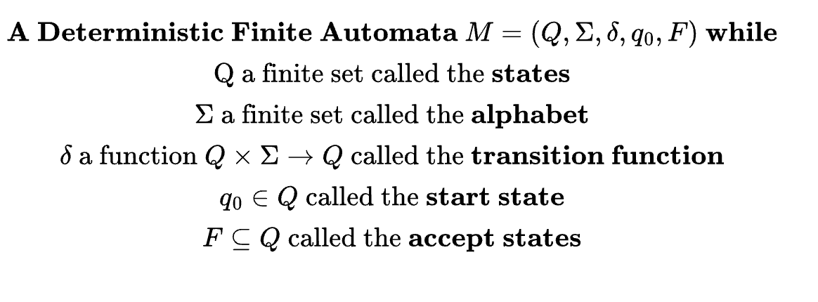 - δ는 현재 상태와 알파벳을 입력으로 받아 다음 상태를 출력하는 전이 함수다.