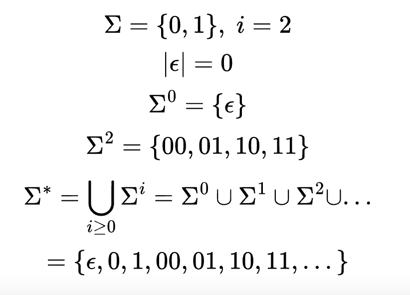- $ \Sigma^{*} $는 주어진 알파벳으로 만들 수 있는 모든 문자열의 집합을 의미한다.