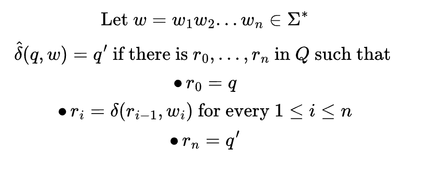δ 전이함수는 입력으로 알파벳을 받는다. 즉, 지금으로써는 110이 오토마타에 입력되었을 때, 출력되는 오토마타의 상태를 수학적으로 표현하려면, $\delta(\delta(\delta(q_0, 110)))$ 처럼 복잡하게 표현해야 한다. 확장된 전이함수(extended transition function)을 이용해서, $\hat{\delta}(q_0, 110)$ 처럼 간단히 표현할 수 있다. 수학적으로 표현하면 아래와 같다.