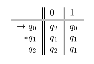 δ 전이 함수를 정의하는 방법이 고민일 수 있다. 첫번째 방법은 앞서 소개한 transition diagram을 이용하는 것이다. 두번째 방법은 transition table을 이용하는 것이다. Figure 2와 같은 형태다. $\to$ 기호는 그 상태가 시작 상태임을, * 기호는 그 상태가 최종 상태임을 표현한다. Diagram을 이용하던, table을 이용하던 우리가 지금 다루는 DFA는 "Deterministic" 하기 때문에, 모든 상태와 모든 입력 알파벳에 대해서 더도말고 덜도말고 딱 하나의 다음 상태가 반드시 존재해야 한다.