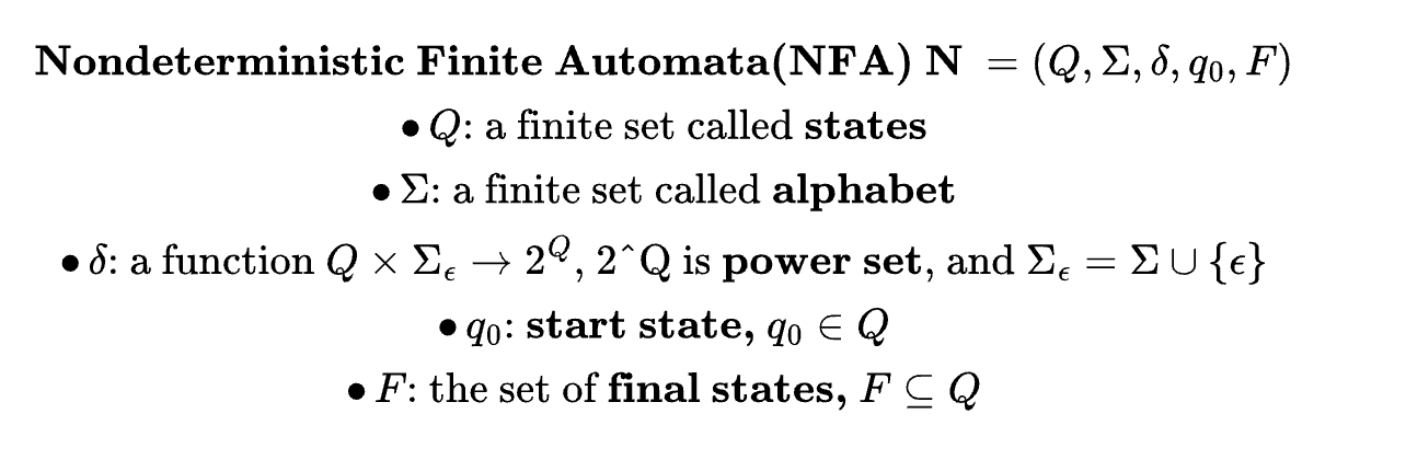 DFA와는 다른 것은 δ의 정의뿐이다. NFA의 전이함수 δ에는 알파벳 뿐만 아니라, ε 또한 입력이 가능하다. 그리고 출력은 Q의 부분집합들의 집합, 즉, 멱집합(power set)이다. 예를 들자면, Figure 3의 $q_2$에서 'a'에 대응하는 화살표는 두 개이므로, $\delta(q_2, a) = \{q_2, q_3\}$ 라고 표현할 수 있다. 반면 $q_1$에서는 $delta(q_1, a) = \phi%다. 그리고, 어떤 NFA N이 인식하는 언어는 아래와 같이 정의된다. Figure 2에서 $\delta(q_0, 00101)=\{q_0, q_2\}$이었고, F의 원소인 $q_2$를 포함했으니, 00101은 '수용'임을 떠올리면, 아래의 정의를 이해할 수 있다.
