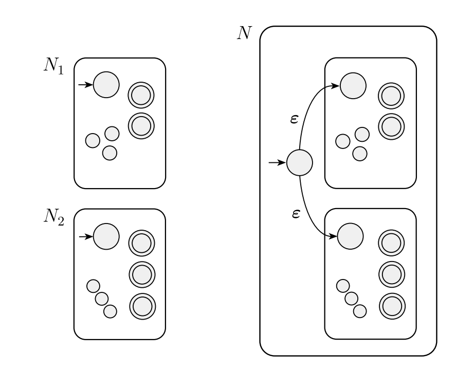 Union의 닫힘성(closure)을 증명해보자. 두 정규언어 A,B를 인식하는 $N_1$과 $N_2$ NFA를 이용하여, $A \cup B$를 인식하는 $N을 만든다면 아래 Figure 4의 왼쪽처럼 만들 수 있다. 오른쪽은 그것을 수학적으로 표현한 것이다.