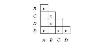 우리는 존재하는 모든 두 상태들끼리의 동등성을 알고 싶기 때문에, 이것을 체크하는 표를 만들것이다. 구구단의 표처럼 가로세로축에 모든 상태들이 포함된 2차원의 표이다. 대신 $p=q$인 경우는 의미가 없고, p와 q가 동등하면, 당연히 q와 p도 동등하므로 표 절반만 채우면 된다. 만약 상태가 5개 있는 오토마타라면, 전체 25칸중 5칸은 제외하고, 그 절반인 10칸을 채우면 되는것이다. 아래는 그 과정이다.