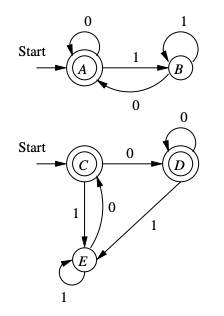 - 문자열 "01"은 A와 E 모두 최종상태인 C로 보낸다. 그러므로, "01"도 A와 E를 구분하지 않는다.