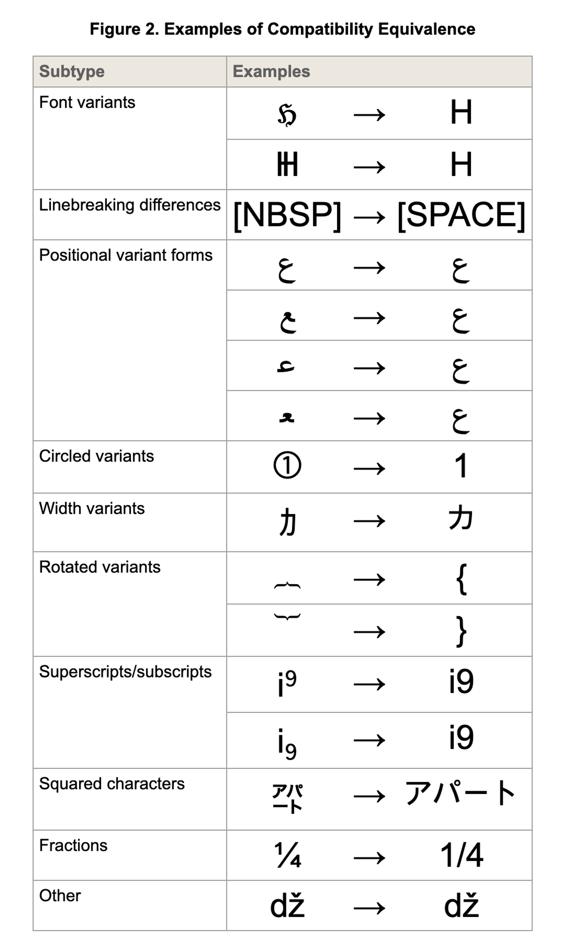 두번째. Compatibility Equivalence입니다. Canoncial Equivalence에 비해 엄격하지는 않으나, 두 글자가 호환되어 동등하게 취급될 수 있음을 의미합니다. 주로 오른쪽의 기본 문자들이 비주얼적인 표현을 위해 왼쪽의 모습으로 변경된 형태임을 확인할 수 있습니다.
